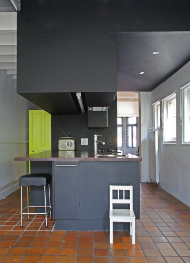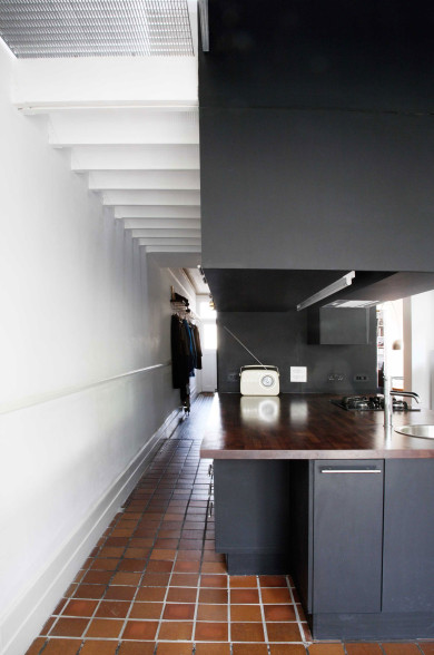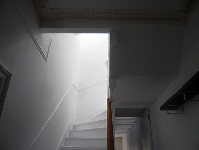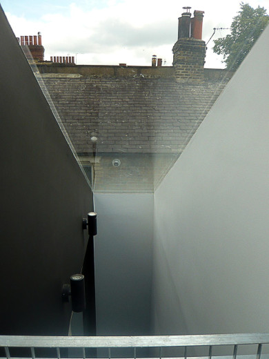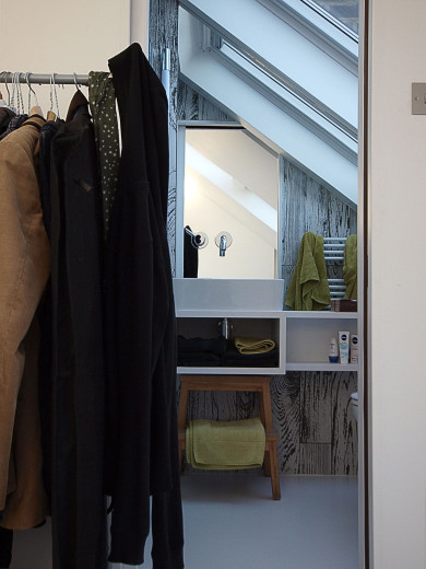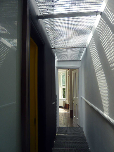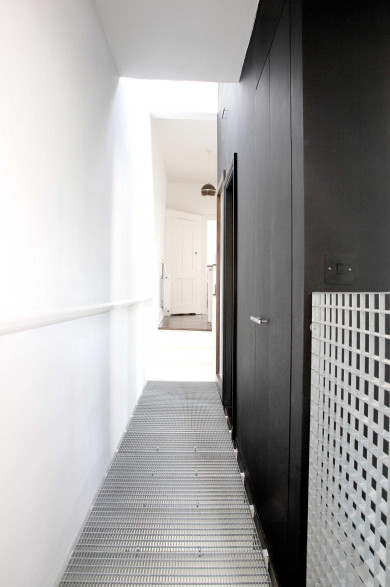 The 4 bedroom property was built in 1897 and features the typical narrow and deep terraced house floor layout with a quite dark area in the middle of the ground floor. All main bedrooms and reception rooms had a nice proportion, light and feel to it. We decided to bring light down to the ground and cut a narrow triple height space into the annex and replaced the 1st floor hallway floor and later the ceiling to the loft area with metal grid. The new scheme created a distinguished hub in the centre which serves the whole house. The kitchen is the block in the middle where you hang out and cook together (great for parties too), the bathroom has internal windows and views without compromising privacy, which allow more borrowed light to reach the depth of the house and features a bathtub, where you can watch the clouds and planes pass by.