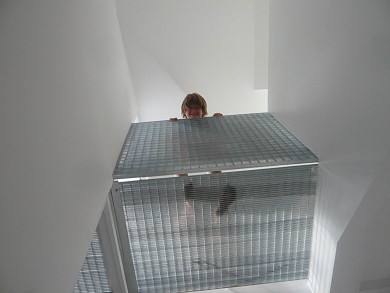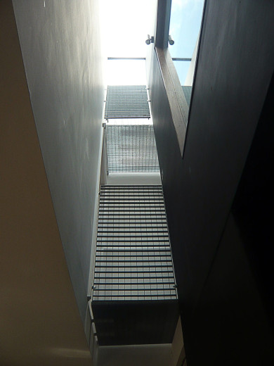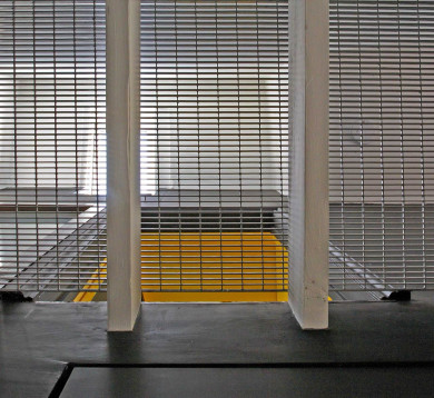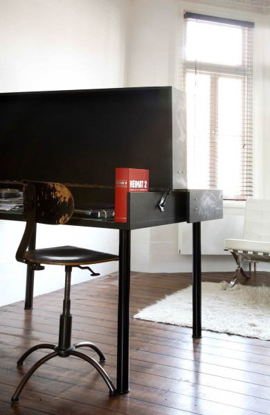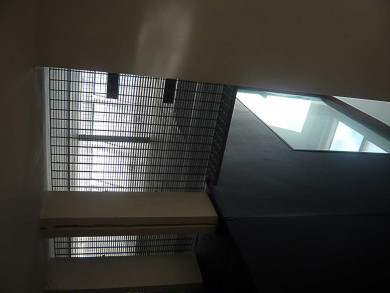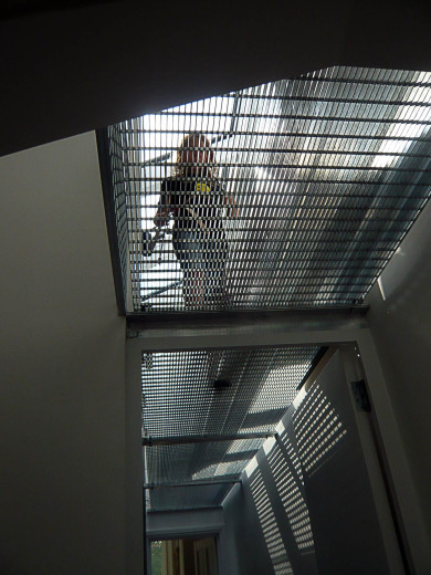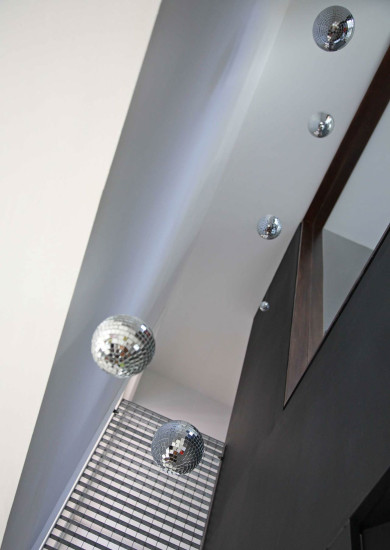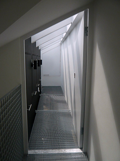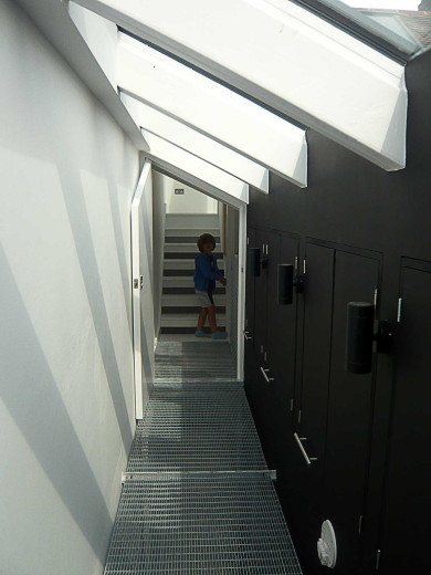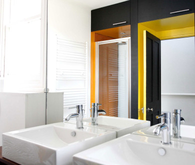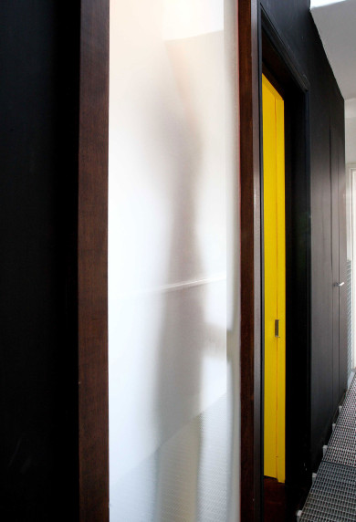 The translucent screen between shower and hall gives you a blurred shadowy outline, an insider joke and reference to our student day hero Rem Koolhaas, who masterly quoted his (and our) idol’s sculpture in the pool of the Barcelona Pavilion of Mies van der Rohe.