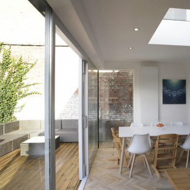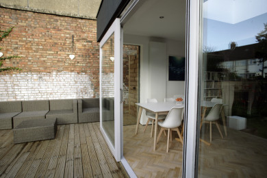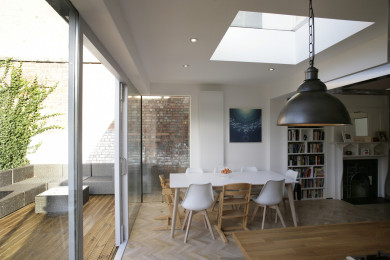 The 1940’s house is then end of the terrace offering a side access and crucial extra width of garden space. The massive exposed party wall of the adjacent period property showed his textured and 100 year old self and right in front of it was the ideal, protected and sunny spot for the garden loungers on the patio. The rear extension features a glass corner addressing the sunny patio area. A big chunky sliding door opens the whole ground floor to the flush patio. Integrated in the façade is a quick travel door from kitchen area to garden. The front reception room was kept as a possible separate living room with panelled, folding doors installed in a newly created opening for flexibility. A long island with bar, generous hob and a big chalkboard back panel offer fun for everyone. Money was wisely spent on some featured materials as for example the beautiful vintage oak parquet.