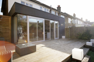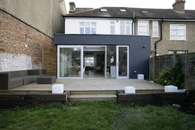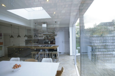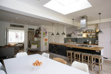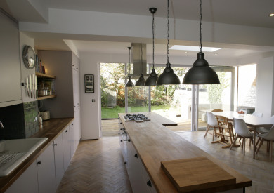 Magic because the transformation of this house was quite astonishing. The new ground floor rear extension and all external structural works replaced a badly built add-on conservatory which was blocking of the already gloomy rear reception room and kitchen from the garden. The clients were in the process of buying the property and together we transformed it in record time for them, their toddler and new born baby to move in.