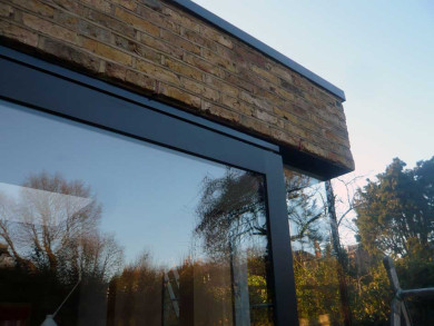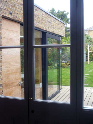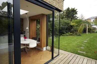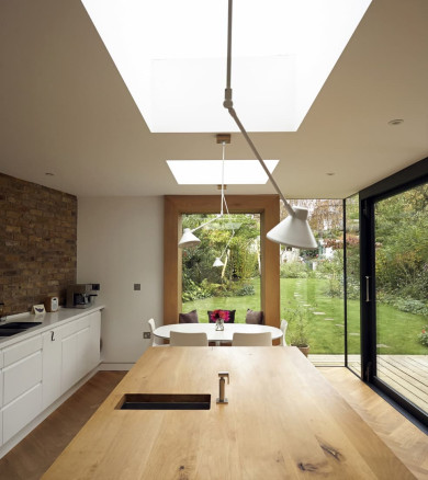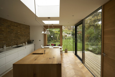 The house features a big and very lovely garden with a very open space towards the houses at the rear. The reception rooms were to keep the direct link and view to patio and garden. Considering the allowed maximum extension depth under the then temporary larger-home-extension rules, the current kitchen was transformed into a utility and cloak room space and the kitchen and dining pushed out further. The need to screen off the neighbours to one side but to allow as much evening sun light to reach the patio produced the current shape and design. A glass corner allows the light to travel past and makes the roof float, it opens up the space to garden and patio alike. The gorgeous view to the garden is framed by the oak lined window seat, this view also organises the island and roof light positions. A chunky black framed sliding door sits within the frameless glass façade and allows the timber parquet floor to merge with the patio decking in summer. For the colder seasons and as a quick everyday access the oak lined timber door can be used.