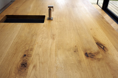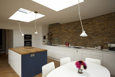 A choice of natural and textured materials like the exposed brick wall and the oak of the parquet floor, the stave worktop and window seat lining is balanced with the accurate and plain elements of the neat, white kitchen run and the sharp glass elements.