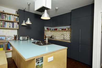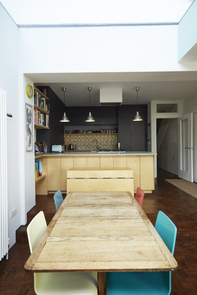 While the previous slightly deteriorated timber decking was raised above garden ground level, the new extension area is lowered and offers a dining / lounge space on patio / garden level with extra height creating further spaciousness. A purpose built Z-shaped timber furniture interlocks with the steps and supports a very space efficient layout; it functions as a bar stool to the kitchen island, offering a home work space next to the shelves in the chimney recess as well as being a bench, which allows the table to be positioned under the generous roof light and able to fit more people.