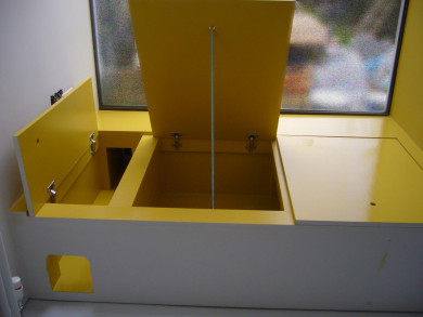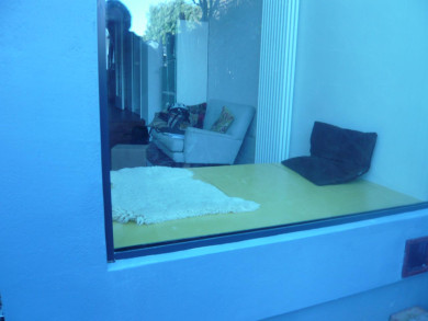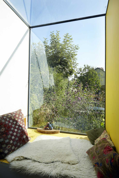 The extension is stepped at the back to emphasize a playful interaction with the garden. The two grey interlocking shapes of the rear elevation translate this idea into the façade design. It creates a bright window seat space fully glazed to the rear and top, which is embedded and surrounded by flowers. This bright yellow sun-trap is big enough to be used for the teenagers’ game of chess, a coffee chat or afternoon snooze.