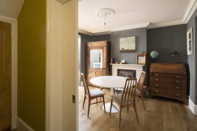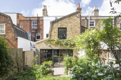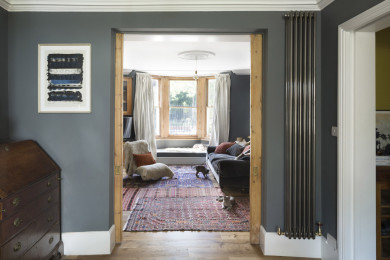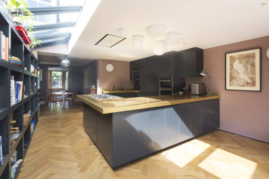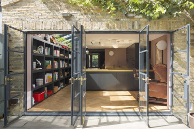 A new bookshelf-framed sliding door arrangement creates long views through the entire ground floor plan and, while allowing a degree of separation when desired, brings the garden visually into the front reception space. A beautiful oak floor links new and old ground floor spaces.