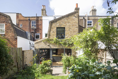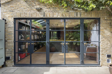 This imposing early 19 century 3 storey town house provided ample spaces for its owners, but a previously added two storey rear annexe was blocking connections to the rear garden and left an under used residual side return area. After a design process, the final scheme incorporates the side return area and re-invents the kitchen as an object around a pre-existing spiral wine cellar. A new large opening connects to the lush raised rear garden and full width roof glazing brings bright sky light into the kitchen and adjacent reception rooms.