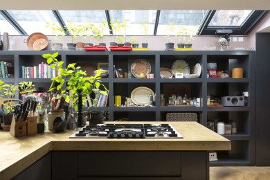 At the rear, the new boundary wall is fully covered by dark finished shelving which perfectly lines up with the full width steel patio doors and roof supports, and together with the matching finished kitchen units, provides centre stage for a luxurious bespoke Brass worktop.
