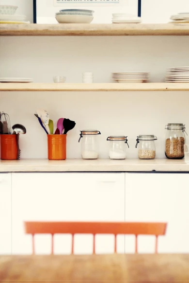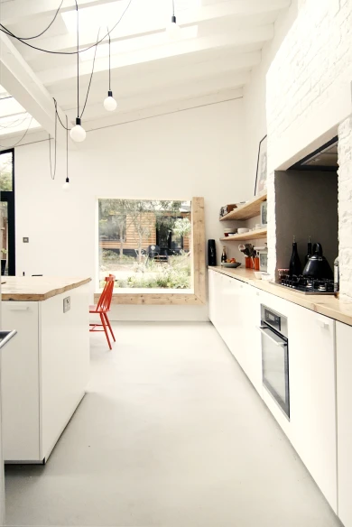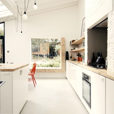 A large, fixed window screen with a deep sill seating frames the view to the garden. Continuous, concrete coloured micro-screed flooring and scaffolding board shelves and worktops underline the use of raw and true materials and create a very generous, free-spirited space, where French country house meets urban gallery.