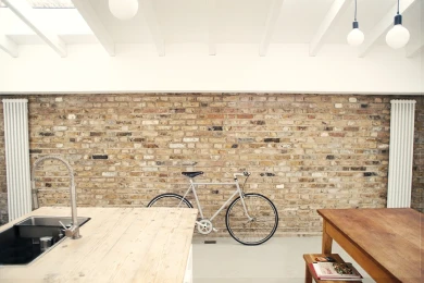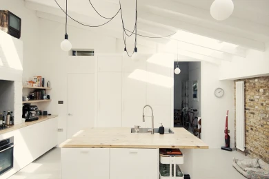 The ceiling is very high, and the roof features an exposed structure of white painted timber joists and a steel beam, timber boarding and large rooflights. On one side of the kitchen the brick walls are painted white, whereas on the other side the Yellow London Stock bricks are shown.