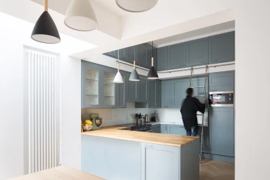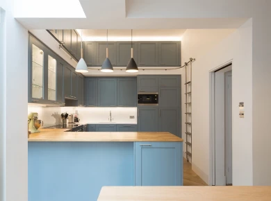 A well-designed lighting scheme and fully glazed roof brightens up the new space. Enhanced by a light oak parquet and gentle grey and blue colour scheme it feels warm, light and generous.