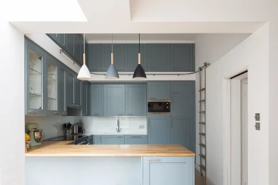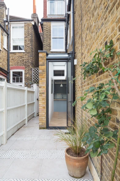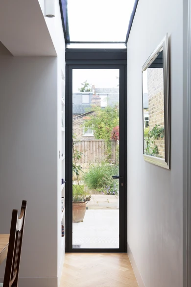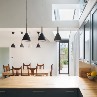 We swapped the functions, added a small side extension, removed a corridor wall, and opened up both areas with neatly designed steel work to replace the rear wall of the main house. This offers a central space in which the dining table is comfortably positioned in the middle and circulation can flow past. The kitchen inhabits the rear reception room and features a library ladder to access the top cabinets. Despite the smallish footprint we managed to maximise kitchen worktop and cupboard space. (A small spare room at the first floor was converted into a utility room next to the main bathroom thus freeing up further kitchen cupboard space). The layout allows for a glimpse of garden and sky while cooking.