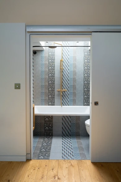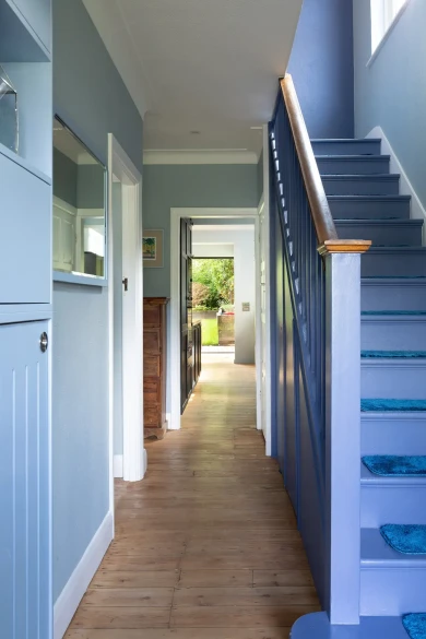 All rooms were refurbished and a continuous pine floor runs through the whole house, combined with various shades of blue, culminating in two quite different tile layouts in the bathrooms allowing different uplifting and relaxing agendas to happen simultaneously.
