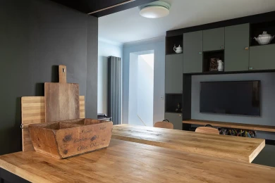 A new interlink was built between the kitchen- dining space and the refurbished garage. The glass rooflight brought much needed light into the core of the house while the new stair led to the new utility room; the rest of the garage was converted to a bike & storage space.