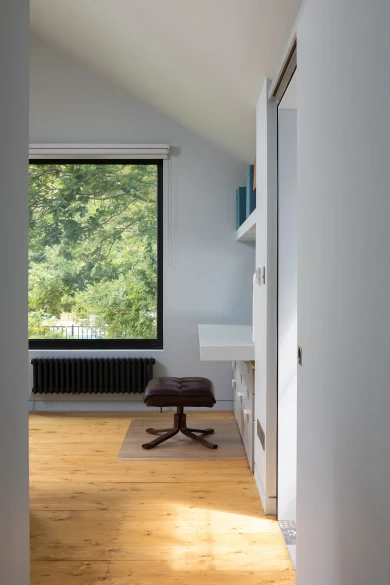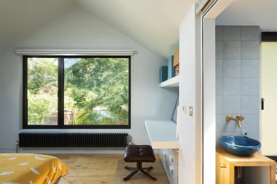 The extra space on the first floor offered the chance to built equal sized bedrooms for the children as well as a masterbedroom with ensuite which focuses on the views into the trees as well.