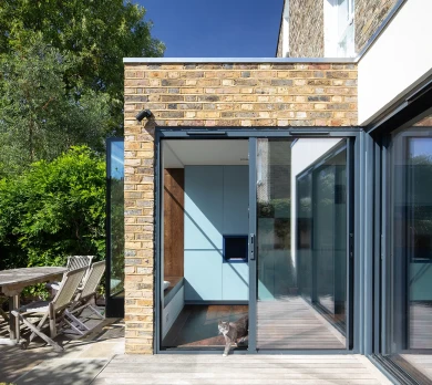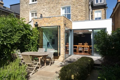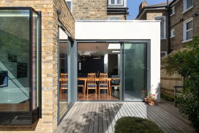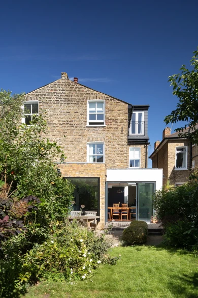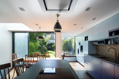 The existing side return extension of this L-shaped period property was done by previous owners 15 years ago and although offering the right space for the kitchen and dining area, was too dark as the rooflights were too small. The flat roof of the extension had resulted in a lowered opening of the rear reception room doors and therefore a dark music room, disconnected from the outside.