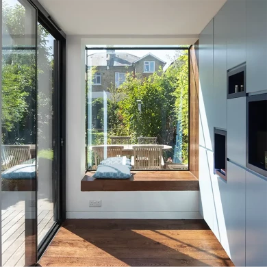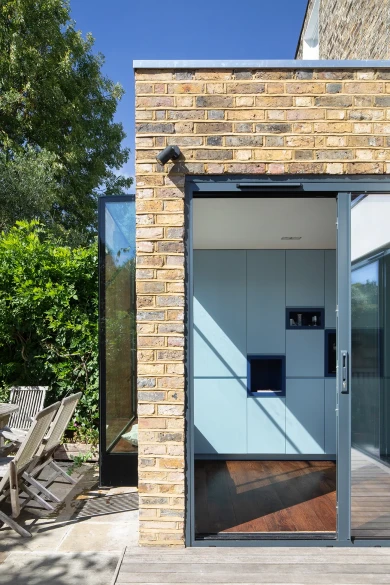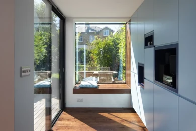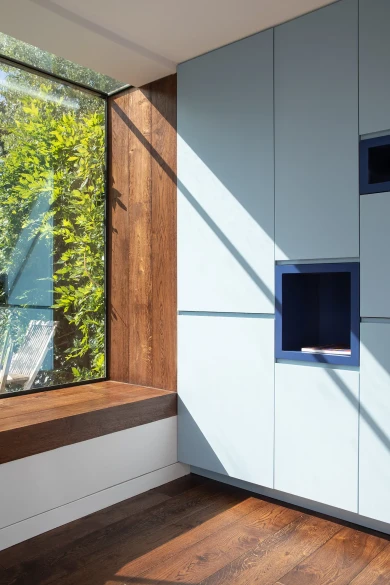 The rear main wall of the house was opened up and the slightly widened annex space integrated into the kitchen area. A rear window ‘outie’ became the focus point of the kitchen, channelling views into the lovely garden and providing a sunny seating area surrounded by greenery. Ceiling, floor and kitchen wall cupboards extend flush into the reconfigured space, while the kitchen focus moved further towards the garden and extra storage space was added towards the reception room wall.