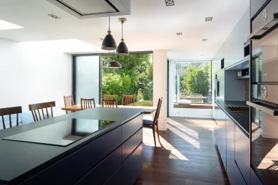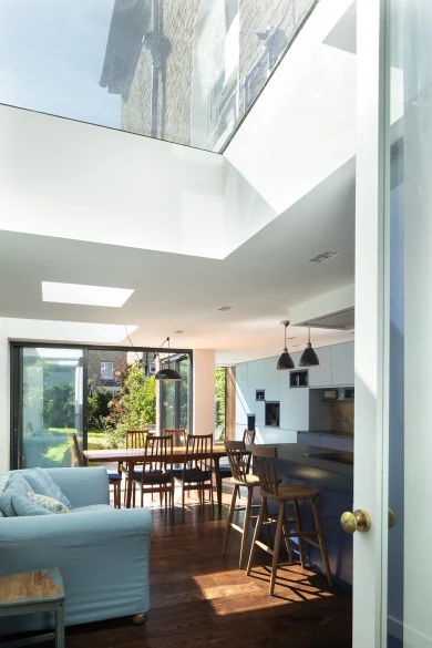 As the kitchen and all finishes needed replacing, the client decided to address the above issues as well. We opened up the roof and ‘replaced’ two of the three rooflights with much larger ones, spanning from flank wall to external wall. Especially the one in front of the reception room door was extended up to the walls, therefore allowing to raise the reception room doors again to their full, original height and letting lots of light in!