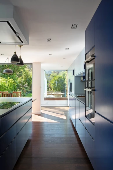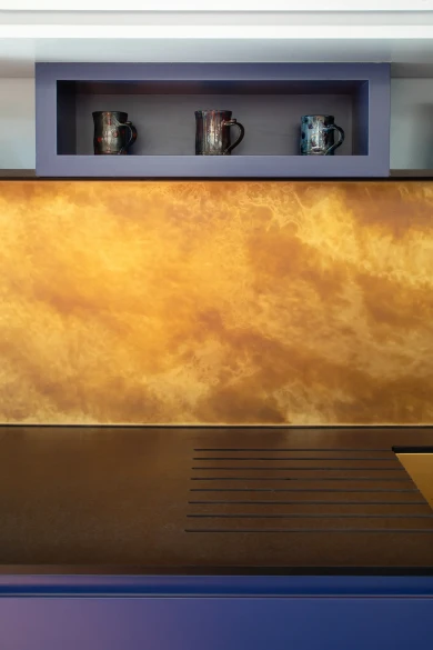 A mahogany stained timber floor complements the playful variations on blue kitchen cupboards, combined with a brass splashback, sink and tap and a dark blue recycled paper worktop! A light and bright space with bold finishes.