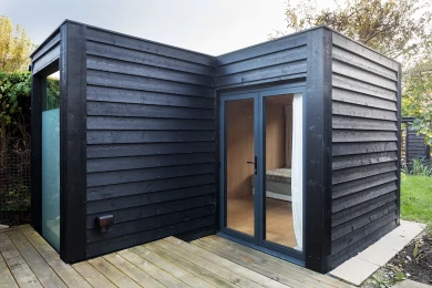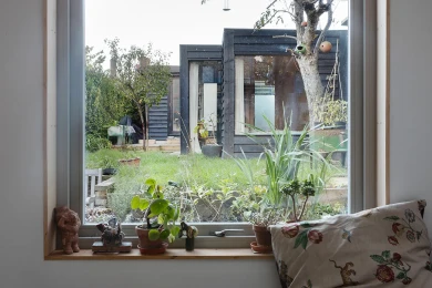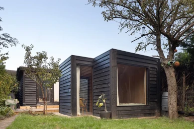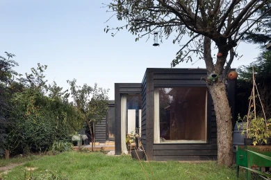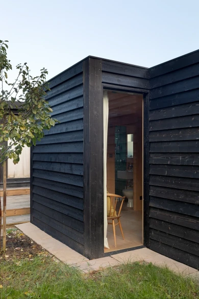 The garden already features a generous artist studio, dug into the ground and positioned at the rear of the garden, facing the kitchen extension on the other end. In order to not be too overbearing the extra space needed to be less bulky and very specific. Minimal and focused on its functions the staggered volumes differentiate the areas inside and the garden zones outside.