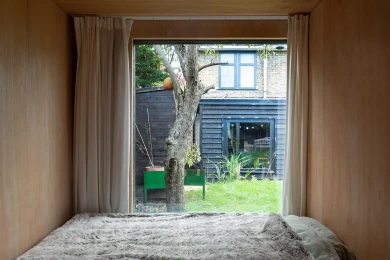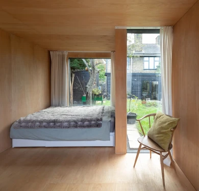 The double bed niche catches the sunlight but is sheltered by the pear tree, the desk area pushes out into the garden, allowing views through and a double door opening onto the rear patio. The bathroom steps back and its full height glazing addresses the sky and the hedges.