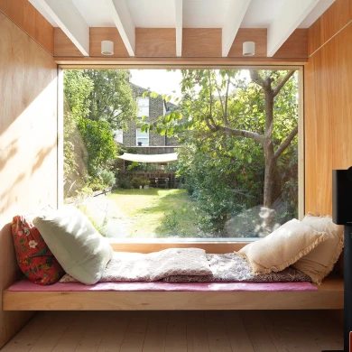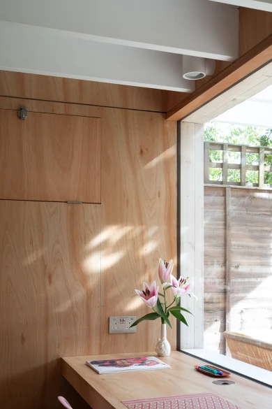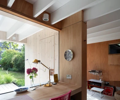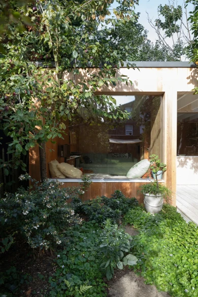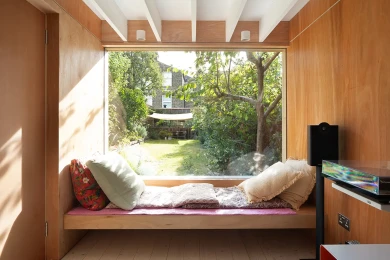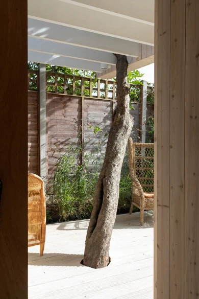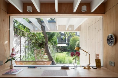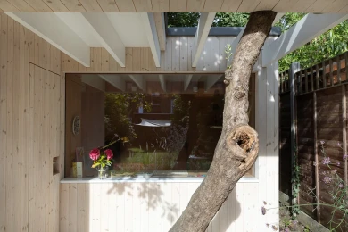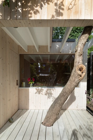 An L-shaped foot print features the recessed and protruding patio, which is partly covered by a continuation of the roof and partly built around the tree. Two big glass screens feature the view from the window seat, also used as a day bed and the built-in double desk towards the garden and sun, one more exposed and one more sheltered by the patio roof.