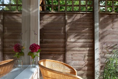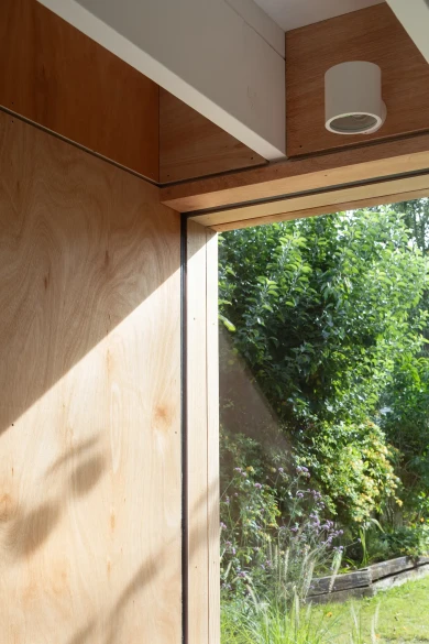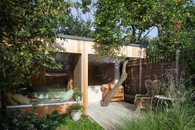 The room is positioned at the end of the long garden, under the trees, sharing its location with a young plum tree and a mature but much-loved apple tree.